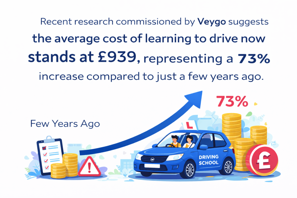 Recent research commissioned by Veygo suggests the average cost of learning to drive now stands at £939, representing a 73% increase compared to just a few years ago. For many households already juggling rising living costs, this figure can come as a surprise.