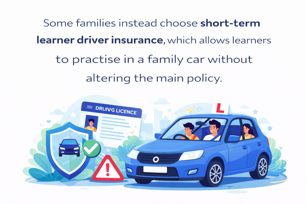 Adding a learner driver to a family car policy can sometimes be expensive and may affect the existing policy. Some families instead choose short-term learner driver insurance, which allows learners to practise in a family car without altering the main policy.