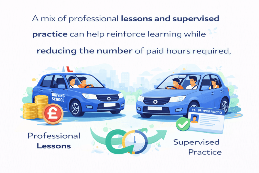 A mix of professional lessons and supervised practice can help reinforce learning while reducing the number of paid hours required.